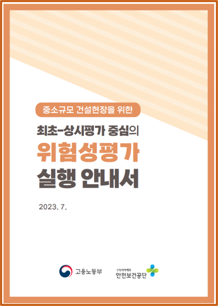3. 2023.7_중소규모 건설현장을 위한 최초-상시평가 중심의 위험성평가 실행 작성자관리자 등록일 25-07-07 조회183회 본문 3. 2023.7_중소규모 건설현장을 위한 최초-상시평가 중심의 위험성평가 실행중소규모 건설현장을 위한 최초-상시평가 중심의 위험성평가 실행 안내서 첨부파일 2023.7_중소규모 건설현장을 위한 최초-상시평가 중심의 위험성평가 실행안내서.pdf (7.7M) 2. 2023.9_ 소규모 사업장을 위한 위험성평가 안내서 4. 2023.6 중소규모 사업자을 위한 쉽고 간편한 위험성평가 방법 안내서 목록