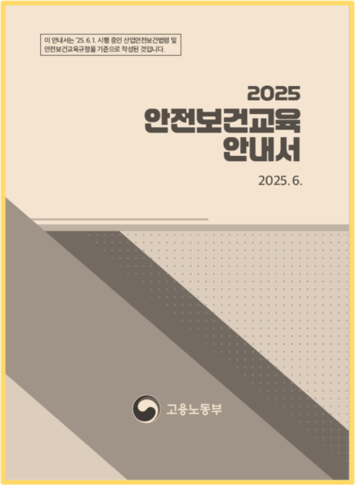 2025 안전보건교육 안내서 작성자관리자 등록일 25-09-20 조회154회 본문 2025 안전보건교육 안내서1. 법정 교육2. 사업장 안전보건교육 실시 방법3. 안전보건교육기관, 직무교육기관4. 안전보건교육 관련 Q%A5. 부록 첨부파일 2025년 안전보건교육 안내서.pdf (9.9M) 와이어로프 사용 및 폐기 결정 가이드 (20개국) 건설기계 충돌 예방 포스터 (16개국) 목록