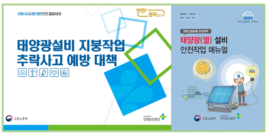 태양광 설비 지붕작업 추락사고 예방대책 및 안전작업 매뉴얼 작성자관리자 등록일 25-08-18 조회229회 본문 태양광 설비 지붕작업 추락사고 예방대책 및 안전작업 매뉴얼 첨부파일 [2020-교육홍보본부-312] 태양광 설비 지붕작업 추락사고 예방 교안.pptx (21.3M) [2016-건설-557] 태양열광 설비 안전작업 매뉴얼내지최종.pdf (10.1M) [2025-교육혁신실-130] 2025 태양광설비 지붕작업 리플릿 Web.pdf (4.1M) [2020-교육홍보본부-390] 태양광설비 지붕작업 리플렛웹용.pdf (1,019.9K) [2020-교육홍보본부-313] 태양광설비 지붕작업 추락사고예방 안전대책_OPL웹용.pdf (576.7K) 국토안전관리원 '굴착기 안전작업 가이드' 발간 지붕 공사 중 추락으로 인한 사고 예방대책 목록