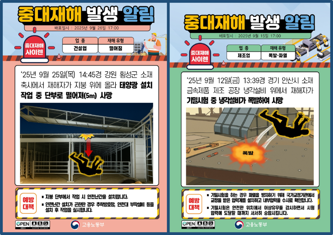 2025년 9월 중대재해 사이렌 모음 (건설, 제조, 기타) 작성자관리자 등록일 25-11-03 조회40회 본문 2025년 9월 중대재해 사이렌 모음 (건설, 제조, 기타) 첨부파일 25년9월중대재해사이렌공개자료중대재해발생알림-건설.pdf (9.9M) 25년9월중대재해사이렌공개자료중대재해발생알림-제조.pdf (6.1M) 25년9월중대재해사이렌공개자료중대재해발생알림-기타.pdf (6.2M) 체인 및 로프 파단에 의한 사고 예방대책 목록