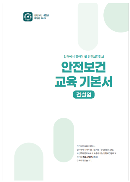 2025 안전보건 교육 기본서 "건설업" 작성자관리자 등록일 25-07-07 조회218회 본문 2025 안전보건 교육 기본서 "건설업"1. 사업장에서 알아야 할 산업안전보건법 주요 내용2. 사업장에서 알아야 할 중대재해처벌법 주요 내용3. 건설업 사망재해 다발작업공종4. 건설업 사망재해 예방대책5. 주요 지원 사업6. 재해예방 유관기관 현황 첨부파일 [2025-교육혁신실-232] 2025년 안전보건 교육 기본서 내지건설업 Web.pdf (7.3M) 온열질환예방지침 (외국인용-17개국) 외국인근로자용 고소작업대 안전작업 가이드 (20개국) 목록