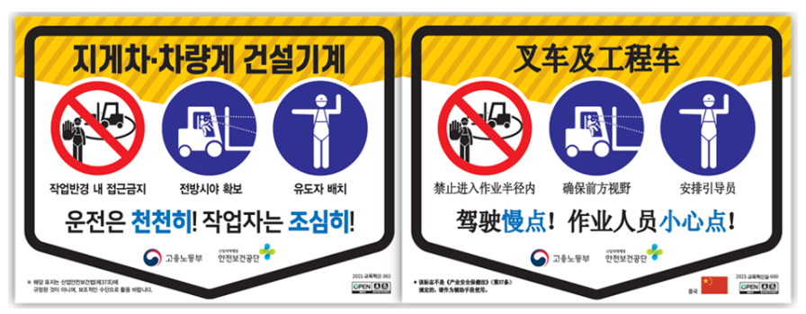 지게차 차량계 건설기계 끼임 사고예방 표지 (외국인용)