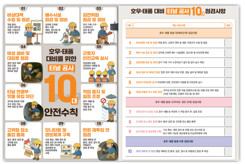 호우태풍 대비를 위한 터널공사 10대 안전수칙 작성자관리자 등록일 25-07-07 조회208회 본문 호우태풍 대비를 위한 터널공사 10대 안전수칙 첨부파일 [2025-건설안전실-283] 터널공사 10대 안전수칙.pdf (19.3M) 개구부에서의 추락에 의한 사고 예방대책 지게차 차량계 건설기계 끼임 사고예방 표지 (외국인용) 목록