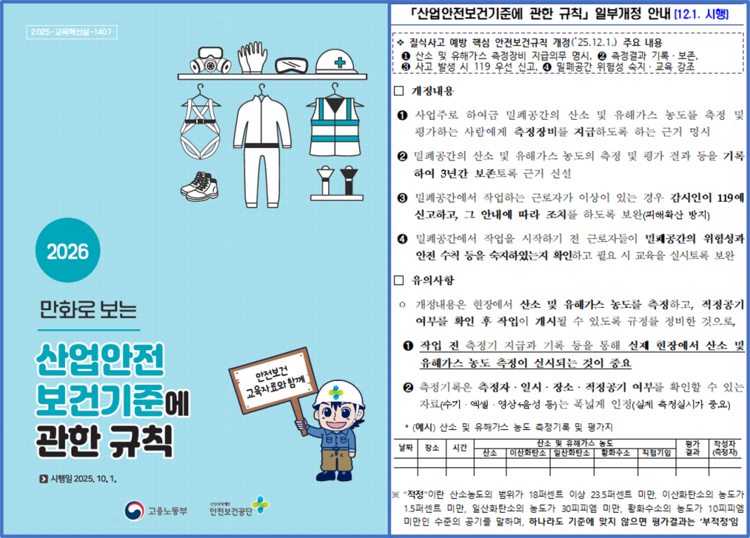 2026 만화로보는 산업안전보건기준에 관한 규칙 및 일부개정(12.1시행) 작성자관리자 등록일 25-12-15 조회55회 본문 2026 만화로보는 산업안전보건기준에 관한 규칙 및 일부개정(12.1시행) 첨부파일 2026 만화로보는 산업안전보건기준에 관한 규칙.pdf (154.4M) 산업안전보건기준에 관한 규칙 일부개정 안내12.1시행.hwp (91.5K) 장시간 근로자 건강관리 2025년 건설업 안전보건관리체계 구축지원 컨설팅 안내서 목록
