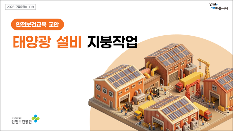 태양광 설비 지붕작업 관련 교안 작성자관리자 등록일 26-03-16 조회35회 본문 태양광 설비 지붕작업 관련 교안 첨부파일 [2026-교육총괄실-118][외부용] 태양광 설비 지붕작업 안전보건교육 교안.pptx (24.6M) 지붕 및 철공공사 사망사고 예방을 위한 OPS Book 목록