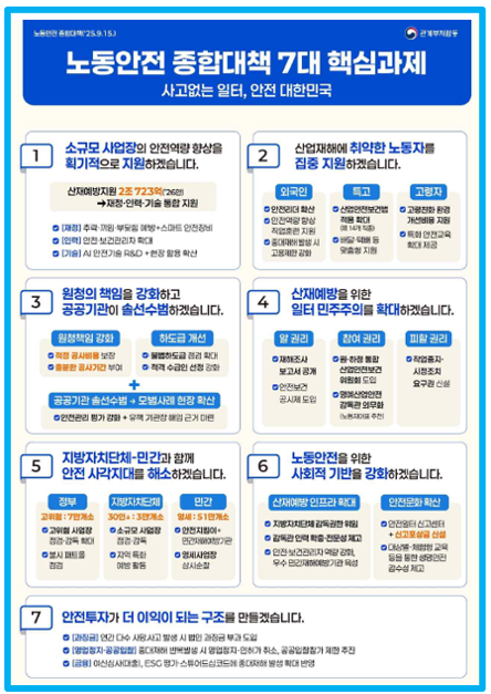 노동안전 종합대책 작성자관리자 등록일 25-09-15 조회148회 본문 노동안전 종합대책 첨부파일 250915 전체본 노동안전 종합대책.pdf (1.9M) 250915 요약본 노동안전 종합대책.pdf (1.1M) 250915 보도자료 노동안전 종합대책 발표산업안전보건정책과.pdf (1.1M) 근로복지공단, 업무상 질병 신속처리 등 새 정부 국정과제 이행 본격화 ‘건설근로자 복지사업’ 만족도 조사 이벤트 실시 목록