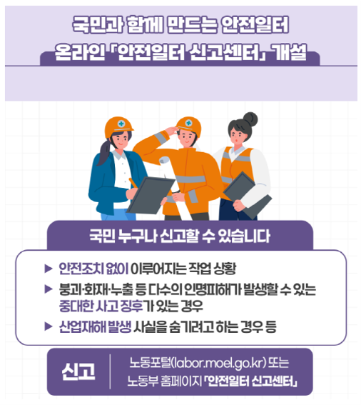 고용노동부(장관 김영훈)는 8월 29일부터 사업장의 산재 위험상황을 온라인으로 신고할 수 있는 「안전일터 신고센터」를 개설합니다.