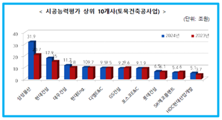 2025년 시공능력평가에서 삼성물산이 12년 연속 1위를 차지했다. 가장 큰 원인은 실질자본금과 경영평점 등을 반영한 경영평가액으로, 삼성물산은 19조9907억 원을 기록해 2위 DL이앤씨(5조8739억 원), 3위 현대건설(4조3192억 원)을 크게 앞질렀다.