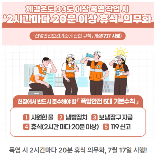폭염 시 2시간마다 20분 휴식 의무화, 7월 17일 시행!