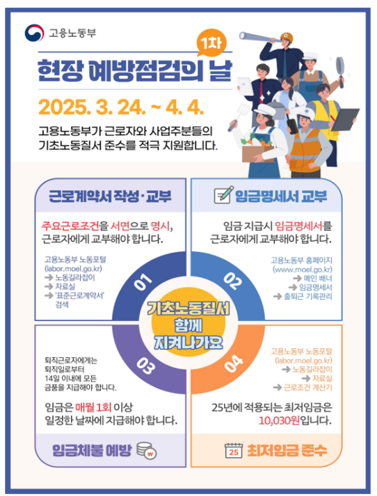 고용노동부는 2025년 첫「현장 예방점검의 날」을 3.24.부터 2주간 집중적으로 운영한다고 밝혔다. 이번 현장 예방점검의 날은 지방노동관서에 신고 사건이 제기된 기업 중 규모가 영세하여 노무관리 여력이 부족한 소규모 기업 4천 개소를 선정하고 근로감독관이 해당 사업장을 직접 찾아 노무관리 전반을 컨설팅하는 방식으로 운영한다. 이를 통해 소규모 기업이 꼭 알아야 할 노동 상식에 대해 자가진단표를 토대로 노무관리 상태를 직접 진단하도록 하고 현장에서 바로 개선하도록 적극 지도하여 더 이상 사건이 제기되지 않도록 할 계획이다.