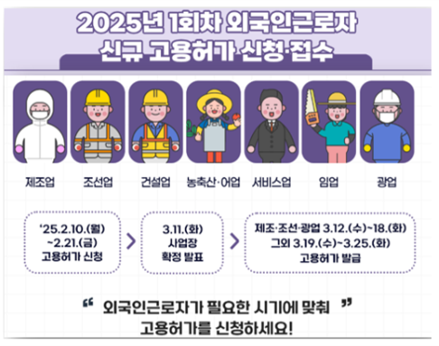 고용노동부는 일할 근로자가 필요한 기업이 제때에 외국인근로자(E-9)를 고용할 수 있도록 '25년도에 5차례 신규 고용허가 신청· 접수를 진행할 예정이라고 밝혔습니다.