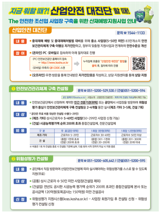지금은 뭐할 때? 산업안전 대진단 할 때 !! 작성자관리자 등록일 25-07-04 조회117회 본문 지금은 뭐할 때? 산업안전 대진단 할 때 !! 첨부파일 지금 뭐할 때 산업안전 대진단 할 때_산재예방사업 안내OPS 최종조선.pdf (4.1M) 노동약자 보호·안전일터 지원을 위한 2025년 「사업장 감독계획」발표 2025년도 외국인근로자 고용허용한도 20% 추가 업종·지역 공고 목록