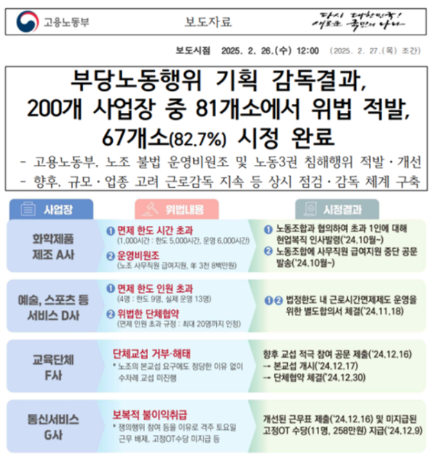 고용노동부, 부당노동행위 기획 근로감독 결과 발표 작성자관리자 등록일 25-07-04 조회117회 본문 고용노동부, 부당노동행위 기획 근로감독 결과 발표 첨부파일 250226 부당노동행위 기획 근로감독 결과 발표노사관행개선과7.pdf (856.8K) 건설현장 추락사고, 매년 10% 이상 단계적 감축 추진 노동약자 보호·안전일터 지원을 위한 2025년 「사업장 감독계획」발표 목록