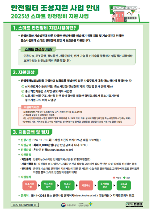 안전일터 조성사업 스마트 안전장비 지원사업 작성자관리자 등록일 25-07-05 조회127회 본문 안전일터 조성사업 스마트 안전장비 지원사업 첨부파일 [2025-중소기업지원실-25]_250212_안전일터 조성지원 OPS스마트.pdf (543.1K) 안전일터 조성사업 제조, 서비스업 등 고위험 개선 사업 건설현장 추락사고, 매년 10% 이상 단계적 감축 추진 목록