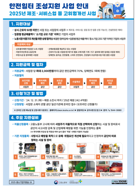 안전일터 조성사업 제조, 서비스업 등 고위험 개선 사업 작성자관리자 등록일 25-07-05 조회117회 본문 안전일터 조성사업 제조, 서비스업 등 고위험 개선 사업 첨부파일 [2025-중소기업지원실-24]_250212_안전일터 조성지원 OPS고위험.pdf (412.0K) 대국민 AI 노동법 상담 서비스 개시 안전일터 조성사업 스마트 안전장비 지원사업 목록