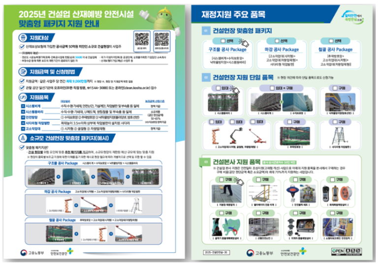2025 건설업 산재예방 안전시설 맞춤형 패키지 지원 작성자관리자 등록일 25-07-05 조회122회 본문 2025 건설업 산재예방 안전시설 맞춤형 패키지 지원 첨부파일 [2025-건설안전실-35]_붙임 건설업 산재예방 안전시설 맞춤형 패키지 지원 안내 OPS.pdf (14.9M) 2025년 건설업 등 자진신고 사업장 보험료 신고 및 납부 재해 없는 사업장을 위해 기업별 맞춤형 컨설팅을 지원합니다! 목록