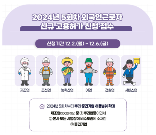 고용노동부는 12월 2일부터 12월 6일까지 전국 지방고용노동관서를 통해 고용허가제 외국인근로자(E-9)에 대한 올해 5회차 신규 고용허가 신청을 받습니다.