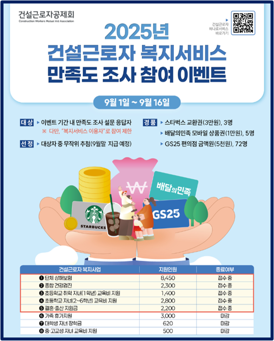 건설근로자공제회(이사장 김상인)는 이달 1일부터 16일까지 '2025년 건설근로자 복지서비스 만족도 조사 참여 이벤트'를 실시한다고 밝혔다. 이번 만족도 조사는 복지서비스별 종합 만족도, 개선의견 수렴 등을 통한 복지서비스 품질 향상을 위해 기획됐다.