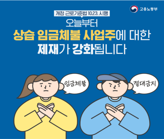 10월 23일부터 상습체불 근절을 위한 개정 근로기준법이 시행됩니다. 개정 근로기준법에 따르면 3개월분 이상 임금을 체불하거나 5회 이상으로 총 3천만원 이상의 임금을 체불하여 상습체불사업주로 확정된 사업주는 신용정보기관에 체불 정보가 공유되어 대출, 이자율 산정 등 금융거래 시 불이익을 받게 되고, 국가, 지방자치단체의 보조·지원사업 참여도 제한됩니다.