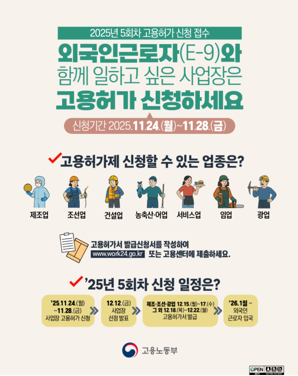 고용노동부(장관 김영훈)는 11월 24일부터 11월 28일까지 전국 지방고용노동관서를 통해 외국인근로자(E-9)에 대한 올해 5회차 신규고용허가 신청을 받습니다.