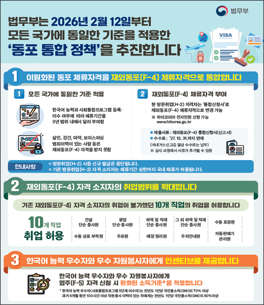1. 동포 체류자격(H-2, F-4)을 ‘재외동포(F-4) 자격’으로 일원화