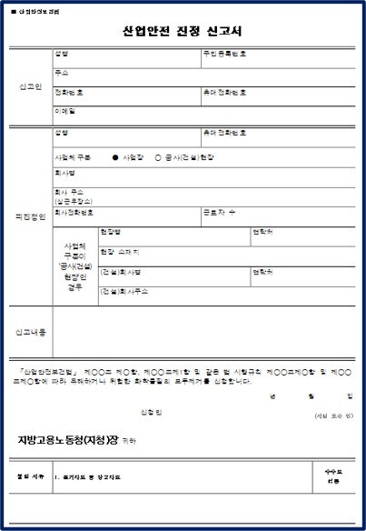 산업안전 진정 신고서 양식 작성자관리자 등록일 25-07-01 조회113회 본문 산업안전 진정 신고서 양식 첨부파일 산업안전 진정 신고서.hwp (36.0K) MSDS 이행실태 자율점검표 제조업 정밀안전점검보고서(게시용) 양식 목록