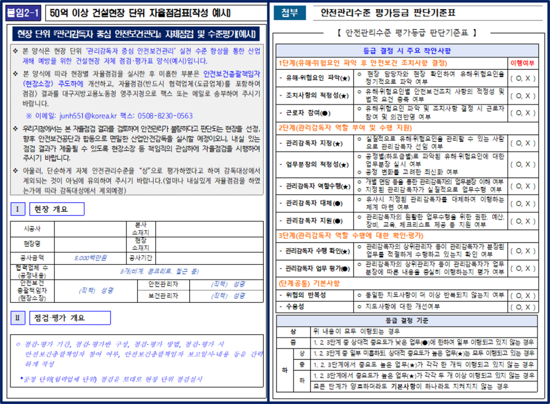 50억 이상 건설현장 단위 자율점검표(작성 예시) 작성자관리자 등록일 25-07-01 조회99회 본문 50억 이상 건설현장 단위 자율점검표(작성 예시) 첨부파일 50억 이상 건설현장 단위 자율점검표 예시 및 양식.hwp (116.5K) 건설현장 자율점검표 건설현장 추락사고 예방 자율점검표 목록