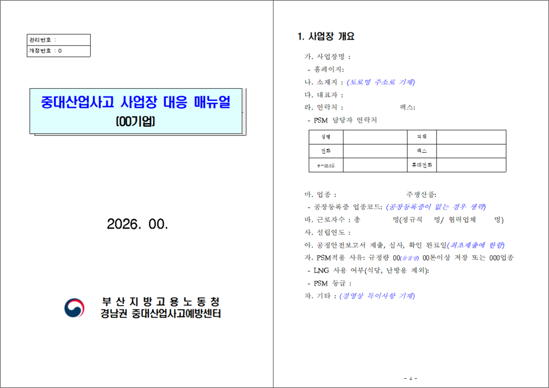 중대산업사고 사업장 대응 매뉴얼 양식 작성자관리자 등록일 26-03-23 조회16회 본문 중대산업사고 사업장 대응 매뉴얼 양식 첨부파일 사업장별 비상대응 매뉴얼 양식2026년.hwp (1.8M) 프레스, 크레인, 사출성형기 자율안전 점검표 양식 목록
