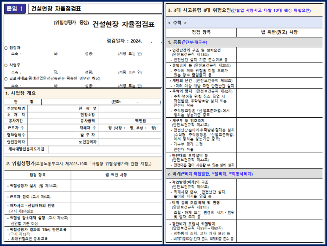 위험성평가 중심 건설현장 자율점검표 작성자관리자 등록일 25-07-01 조회116회 본문 위험성평가 중심 건설현장 자율점검표 첨부파일 붙임 1. 위험성평가 중심건설현장 자율점검표.hwp (62.5K) 사업장별 사고대응 메뉴얼 양식 (부산청) 온열질환 예방 자율점검표 목록
