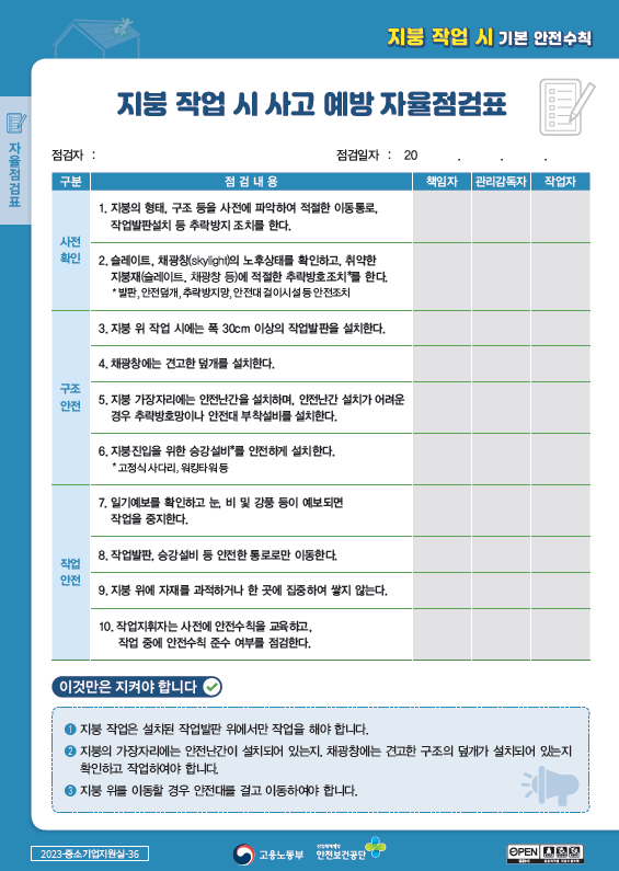 작업시 사고예방 자율점검표 작성자관리자 등록일 25-07-01 조회83회 본문 작업시 사고예방 자율점검표 1. 지붕작업 시 2. 트럭 사용 작업 시 3. 단부, 개구부 인근 작업 시 4. 사다리 사용 작업 시 5. 굴착기 사용 작업 시 6. 달비계 사용 작업 시 7. 고소작업대 사용 작업 시 등 첨부파일 [2023-중소기업지원실-36]_[자율점검표] 위험요인별_230612.pdf (14.1M) 50억 미만 건설현장 추락사고 예방 자율점검표 굴착작업 작업계획서 작성 교안 및 샘플 목록