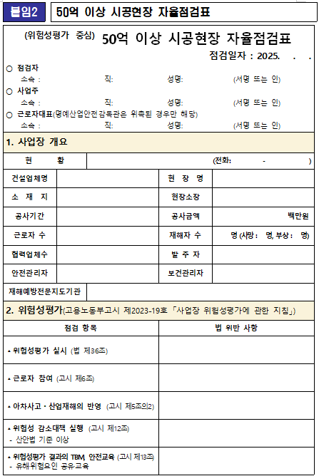 50억 이상 시공현장 자율점검표 작성자관리자 등록일 25-07-01 조회91회 본문 50억 이상 시공현장 자율점검표 첨부파일 붙임2. 50억 이상 시공현장 자율점검표.hwp (64.0K) 고위험 건설기계장비 안전점검표(5종) 50억 미만 건설현장 추락사고 예방 자율점검표 목록