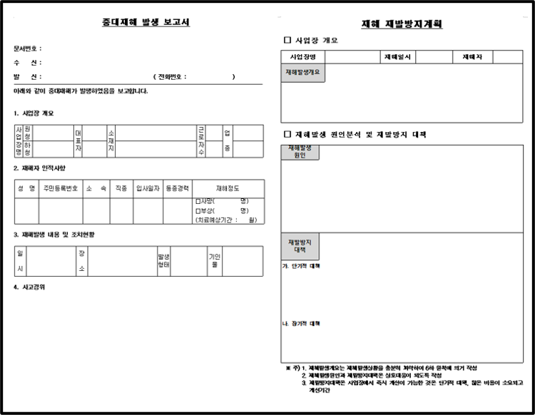 중대재해 발생 보고서 양식 작성자관리자 등록일 25-11-24 조회62회 본문 중대재해 발생 보고서 양식 첨부파일 중대재해발생보고서.hwp (33.0K) 위험성평가 관련 양식 건설현장 사망사고 핵심 위험요인 자율점검표 및 추락사고 예방 자율점검표 목록