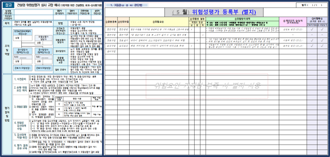 위험성평가 관련 양식 작성자관리자 등록일 25-11-25 조회39회 본문 위험성평가 관련 양식 첨부파일 위험성평가 실시규정 예시최초-상시평가용.hwp (1,013.0K) 위험성평가_등록부3등급.hwp (65.5K) 위험성평가_및_점검_회의록3등급.hwp (142.5K) 위험성평가_실시규정_예시120억원 미만 건설현장, 최초-상시평가용.hwp (129.5K) TBM_회의록.hwp (39.5K) 건설업 2024년 안전보건관리체계 컨설팅 매뉴얼 중대재해 발생 보고서 양식 목록