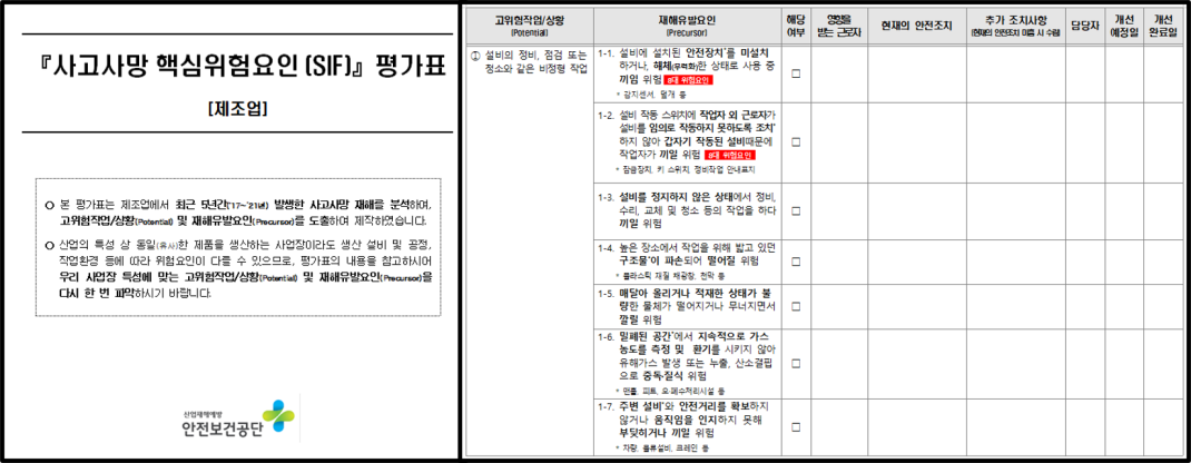 제조업 사고사망 핵심위험요인SIF 평가표(수정) 작성자관리자 등록일 25-11-25 조회29회 본문 제조업 사고사망 핵심위험요인SIF 평가표(수정) 첨부파일 제조업 사고사망 핵심위험요인SIF 평가표수정.hwp (285.0K) 건설업 고위험요인(SIF ) 평가표 통합본(링크가능) 노사협의회 운영 매뉴얼 및 각종 양식 목록