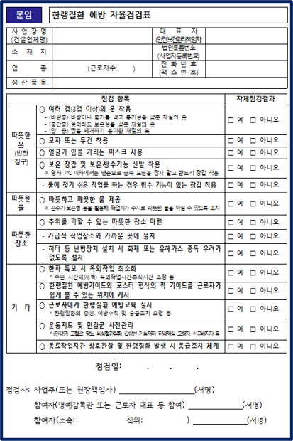 한랭질환 예방 자체점검표 작성자관리자 등록일 25-11-25 조회36회 본문 한랭질환 예방 자체점검표 첨부파일 한랭질환 예방 자체점검표.hwpx (73.7K) 건설업 자율안전컨설팅 관련 양식 건설업 고위험요인(SIF ) 평가표 통합본(링크가능) 목록
