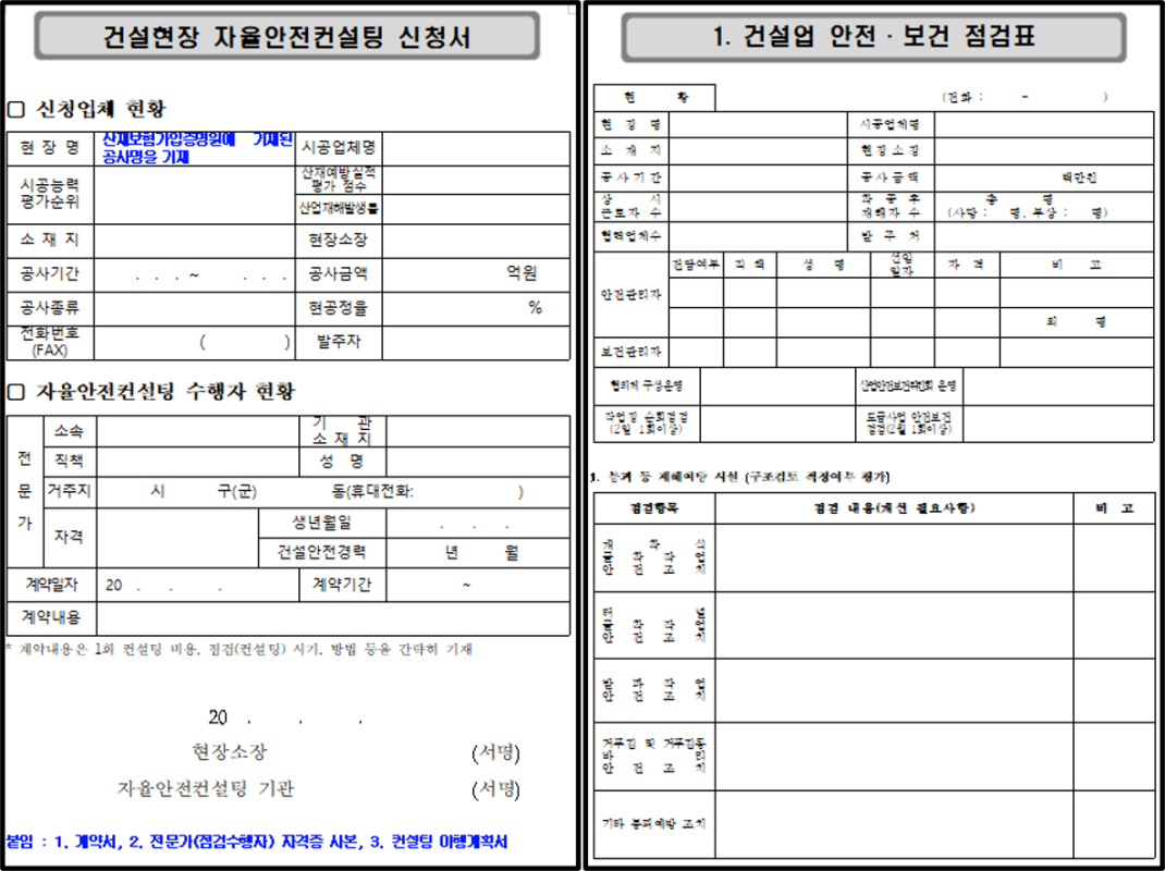 건설업 자율안전컨설팅 관련 양식 작성자관리자 등록일 25-11-26 조회34회 본문 건설업 자율안전컨설팅 관련 양식 첨부파일 자율안전컨설팅 신청서.hwp (45.0K) 자율안전컨설팅 점검표 양식.hwp (42.5K) 공사규모별 외부전문가 요건.hwp (40.5K) 사업장 현황표(제조, 건설) 및 자체 점검표 한랭질환 예방 자체점검표 목록