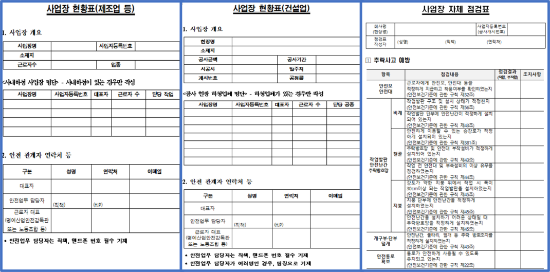 사업장 현황표(제조, 건설) 및 자체 점검표 작성자관리자 등록일 25-11-26 조회52회 본문 사업장 현황표(제조, 건설) 및 자체 점검표 첨부파일 사업장 현황표건설업.hwp (41.5K) 사업장 현황표제조업 등.hwp (37.0K) 사업장 자체점검표.hwpx (88.7K) 일요일 공휴일 작업계획서 제출 서식 건설업 자율안전컨설팅 관련 양식 목록