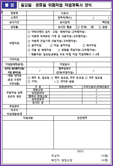 일요일 공휴일 작업계획서 제출 서식 작성자관리자 등록일 25-11-26 조회40회 본문 일요일 공휴일 작업계획서 제출 서식 첨부파일 일요일 공휴일 작업계획서 제출 서식.hwp (52.0K) 건설현장 안전보건조직도 양식 사업장 현황표(제조, 건설) 및 자체 점검표 목록