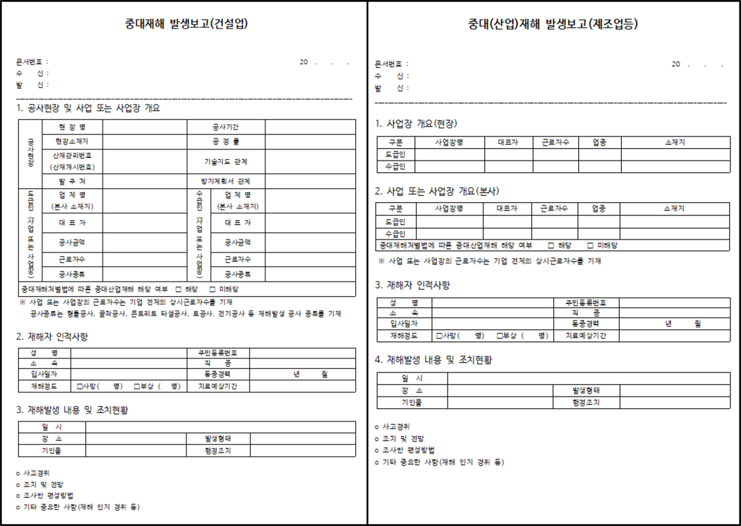 중대재해 발생보고 양식 (건설업, 제조업 등) 작성자관리자 등록일 26-01-12 조회41회 본문 중대재해 발생보고 양식 (건설업, 제조업 등) 첨부파일 중대재해 발생보고 서식건설업.hwp (51.5K) 중대재해 발생보고 서식제조업등.hwp (41.0K) 산업재해 조사표 (개정 2025.05.30) 산업안전보건법 시행규칙 개정 별지 서식 (25호 ~ 28호) (2025.12.26 개정) 목록