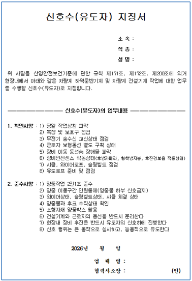 신호수(유도자) 지정서 (장비작업계획서 첨부서류) 작성자관리자 등록일 26-02-09 조회126회 본문 신호수(유도자) 지정서 (장비작업계획서 첨부서류) 첨부파일 신호수유도자 지정서장비작업계획서 첨부서류.hwp (49.5K) 작업지휘자 지정서 (장비작업계획서 첨부서류) 노사협의체 합동 안전보건점검 양식 목록