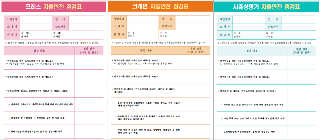 프레스, 크레인, 사출성형기 자율안전 점검표 양식 작성자관리자 등록일 26-03-16 조회19회 본문 프레스, 크레인, 사출성형기 자율안전 점검표 양식 첨부파일 사출성형기 자율안전 점검표.hwp (74.0K) 크레인 자율안전 점검표.hwp (74.5K) 프레스 자율안전 점검표.hwp (74.0K) 중장비 작업계획서 및 중량물 취급계획서 양식 목록
