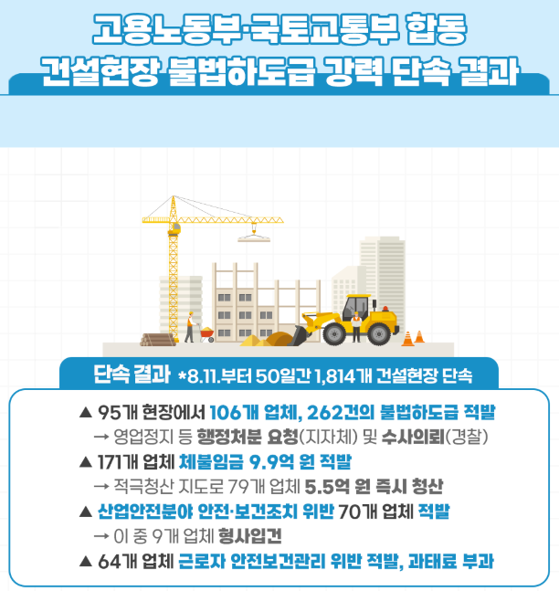 고용노동부(장관 김영훈)와 국토교통부(장관 김윤덕)는 8월 11일부터 50일간(8.11 .~ 9.30.) 지자체, 공공기관* 등 관계기관 합동으로 실시한 건설공사 불법하도급 강력 단속 결과를 공개했습니다.